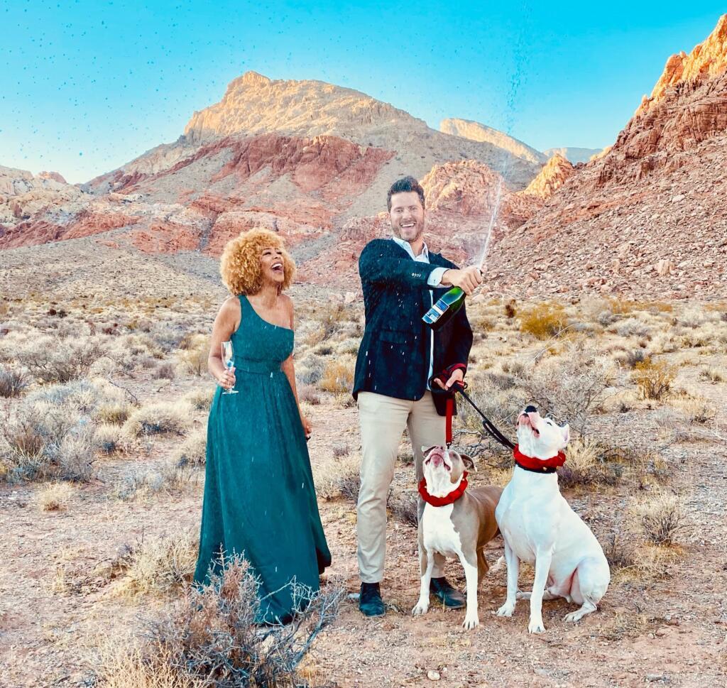Given COVID-19 restrictions and the fact that their family and friends are spread across the country, they decided to elope “in true Las Vegas fashion,” Deanne jokes. Their venue wasn’t exactly a drive-in chapel, though. They were married in 2021 on a small animal rescue farm lined with palm trees in the northern part of the city, while horses, chickens, and goats roamed nearby. After the ceremony, they drove back to the city for dinner. “Everything was smooth,” says Josh. “There was zero stress involved.”