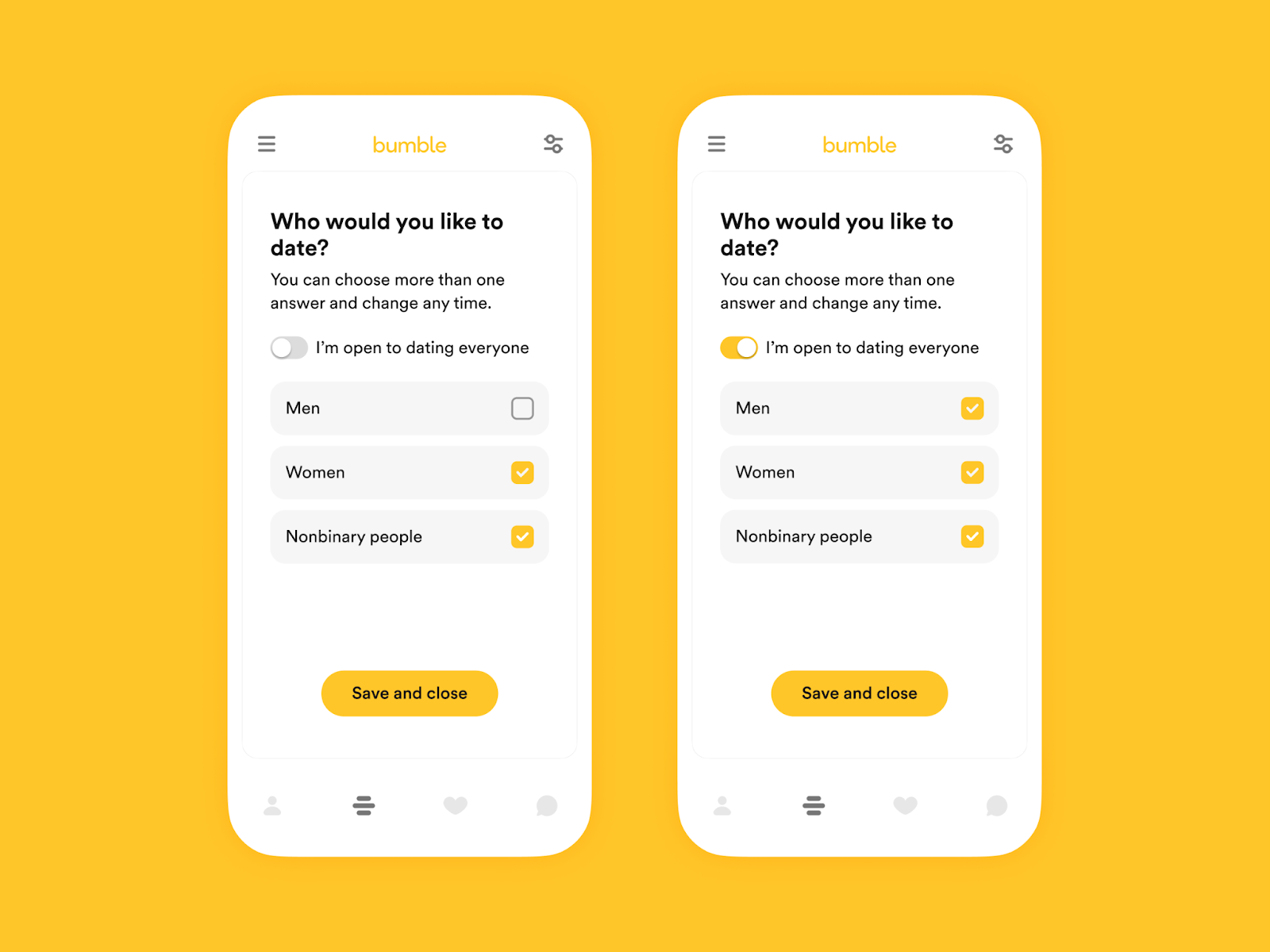 また、マッチングしたいお相手のジェンダーも選択できます。Bumbleに登録する際、Dateモードを選択すると、付き合いたいお相手のジェンダーについての質問が表示されます。女性、男性、ノンバイナリーのいずれか、その内2択、またはジェンダーを問わずにすべてのお相手から選択します。性自認、性的指向、フィルターの好みは、いつでも、何度でも変更可能です。