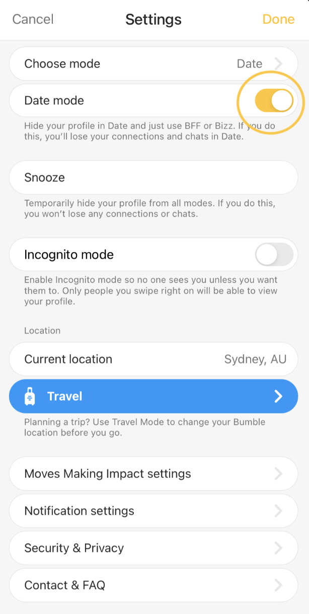 예, Bizz 및 BFF 모드는 이용한 채 Date 모드는 삭제하실 수 있습니다! 다음의 간단한 단계를 따라주시면 됩니다.