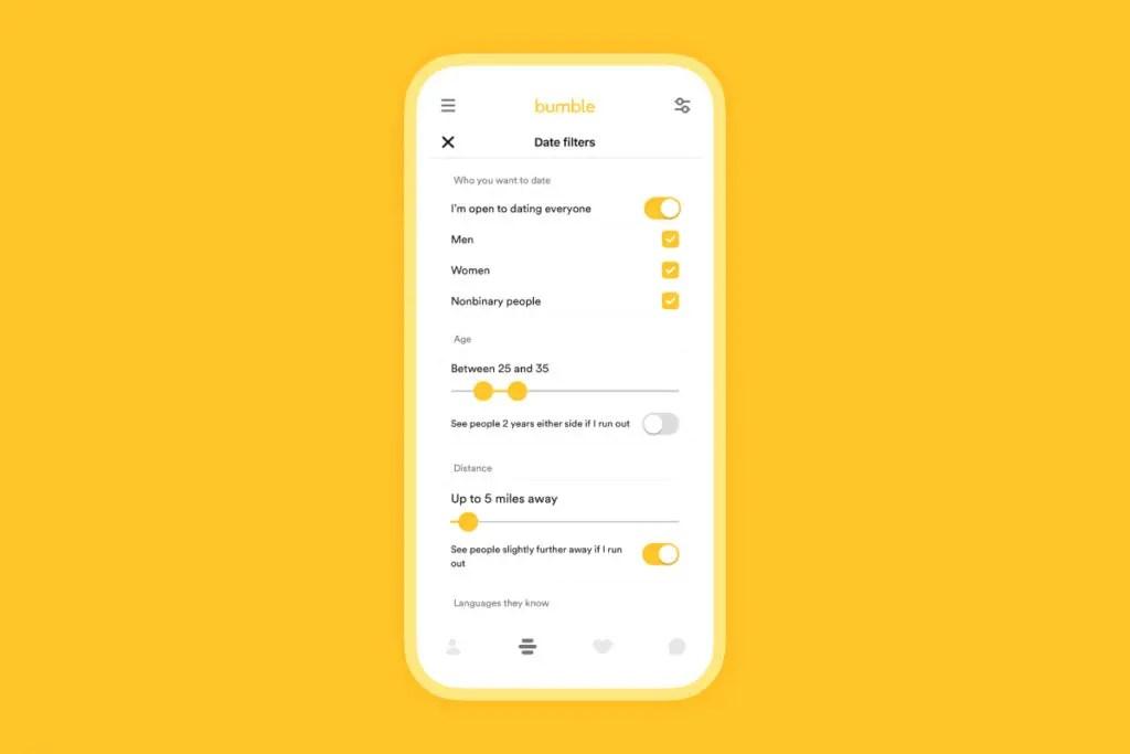 This is where Bumble’s Filters come in. Our Basic Filters help narrow down your search so that the profiles you’re swiping through are people who match your non-negotiables. This allows you to choose who you want to date (men, women, nonbinary people, everyone, or a combination of these options), their age, their distance from you, and the languages they speak.